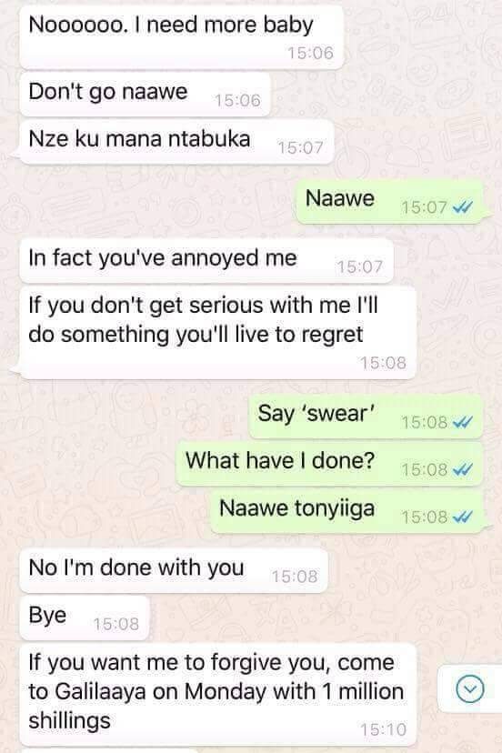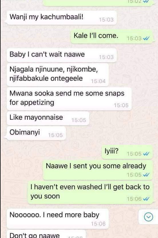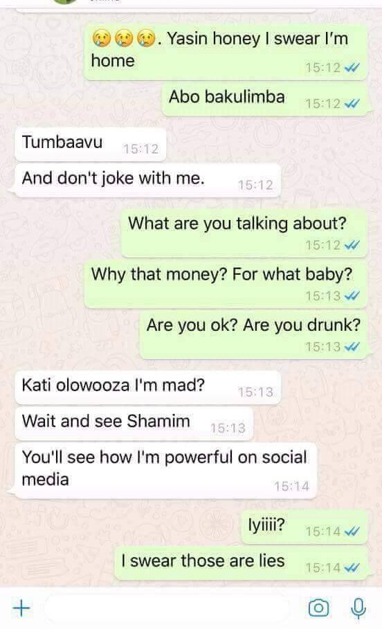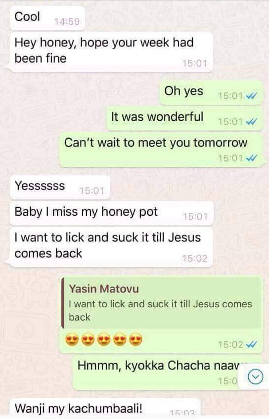 Screenshots of Shamim’s WhatsApp chat with Yasin (Boyfriend) reveal that the two enjoyed an intimate relationship till everything went sour. In the first screenshot, Yasin is seen asking Shamim how her week was which question she responded to with great excitement over their “appointment” the following day. A seemingly horny Yasin told her how he too couldn’t wait to lick and suck her honey pot till “Jesus comes back.” (Such Blasphemy!!!).